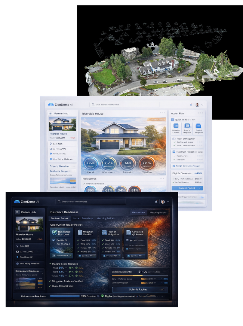 ZionDome combines a digital twin and scenario engine with deployable, on-site protection — and a verified evidence loop that insurers and public agencies can trust. We don’t just detect risk; we turn mitigation into documented actions and measurable loss reduction.